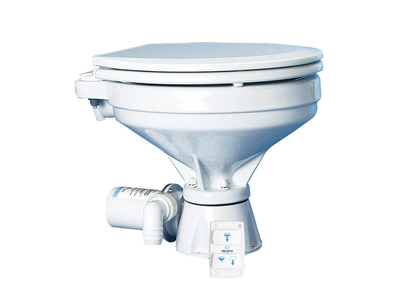 Water is from existing pressurized water system onboard with 24V solenoid valve (PN 07-66-031) or 24V flush pump (PN 07-66-033)- not included! Silent operation and low water consumption. Easy to clean white regular ceramic bowl and white thermoplastic softclose seat.