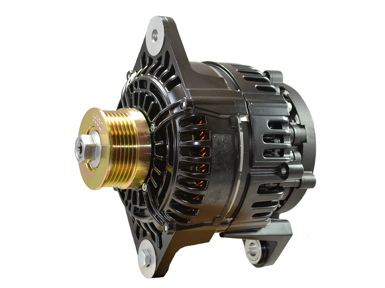 Alternator, 97XD Series, 190A, 24V, Saddle Mount (Dual Foot), 4in, K6 Serpentine, Case Ground, 4″ J-180-Style Mounting; Typical for Caterpillar, Cummins, Detroit Diesel & John Deere Engines.