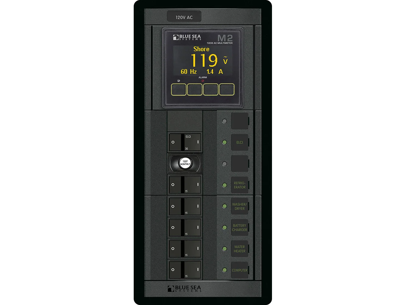Part of the Blue Sea Systems Battery Management Panels. This one standard panel features Equipment Leakage Circuit Interrupter (ELCI) protection with branch breakers and will reduce the risk of fire and shock hazards caused by defects in appliances and circuit wiring.
