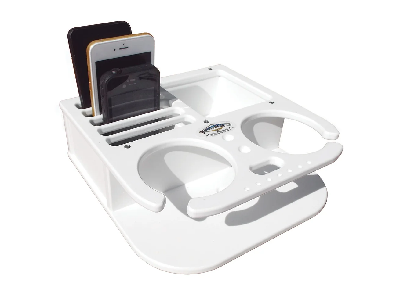 Have phones? Have friends with phones? The BH-2 Cell can help! Holds up to five phones (fits phones with waterproof cases), also can hold two drinks. Has a storage box for all the other loose items that end up everywhere. Comes with suction cups, or can be permanently mounted. Overall dimensions: 9 3/4" x 9 3/4" x 3." Box Dimensions: 4" x 4 1/4" x 3" deep and will fit everything from wallets to cameras to sunscreen, etc. 3.5" Diameter cup hole size. Made out of Starboard, lifetime warranty. Made in America, tested on the water!