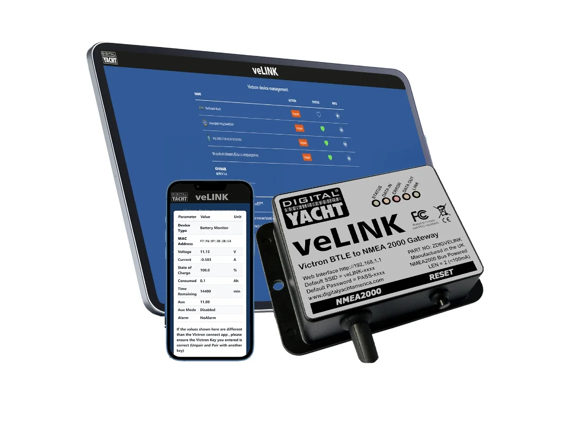 veLink allows you to wirelessly connect up to eight Victron devices equipped with a Bluetooth interface to your NMEA 2000 network, covering the vast majority of installations.