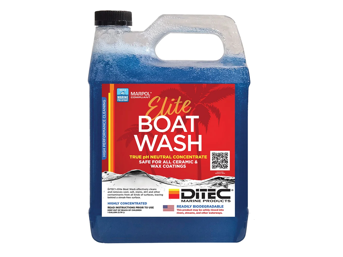 Readily biodegradable, true pH-neutral concentrate. Safe for all exterior surfaces, including ceramic-coated and waxed boats. Highly concentrated, gel productSuper sudsy formulaSafe to rinse into all waterways. Dries streak-free. One gallon of concentrate makes 128 gallons of boat wash, MARPOL-compliant and classified as ‘not a marine pollutant’