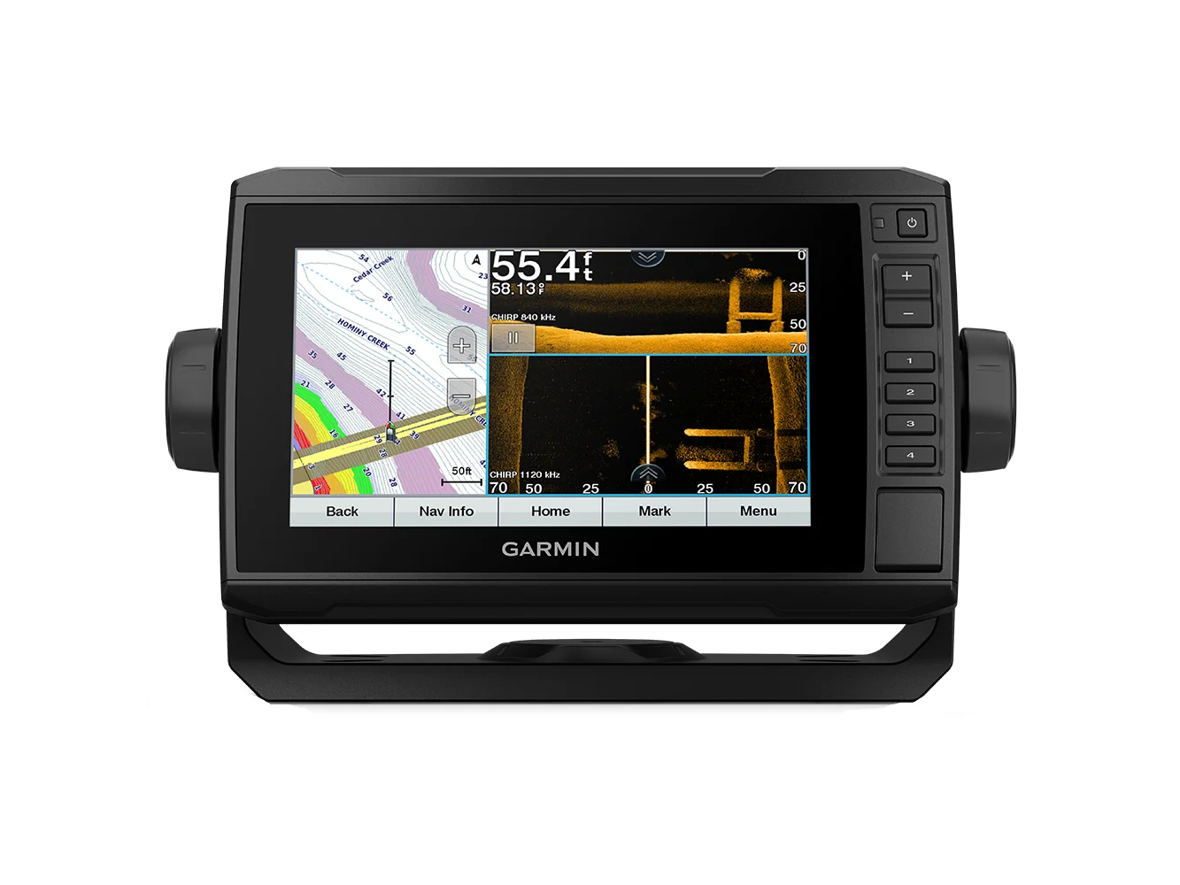 The sunlight-readable 7” touchscreen chartplotter features a quick-release bail mount, and the transducer bundle adds Ultra High-Definition scanning sonar and CHIRP traditional sonar.