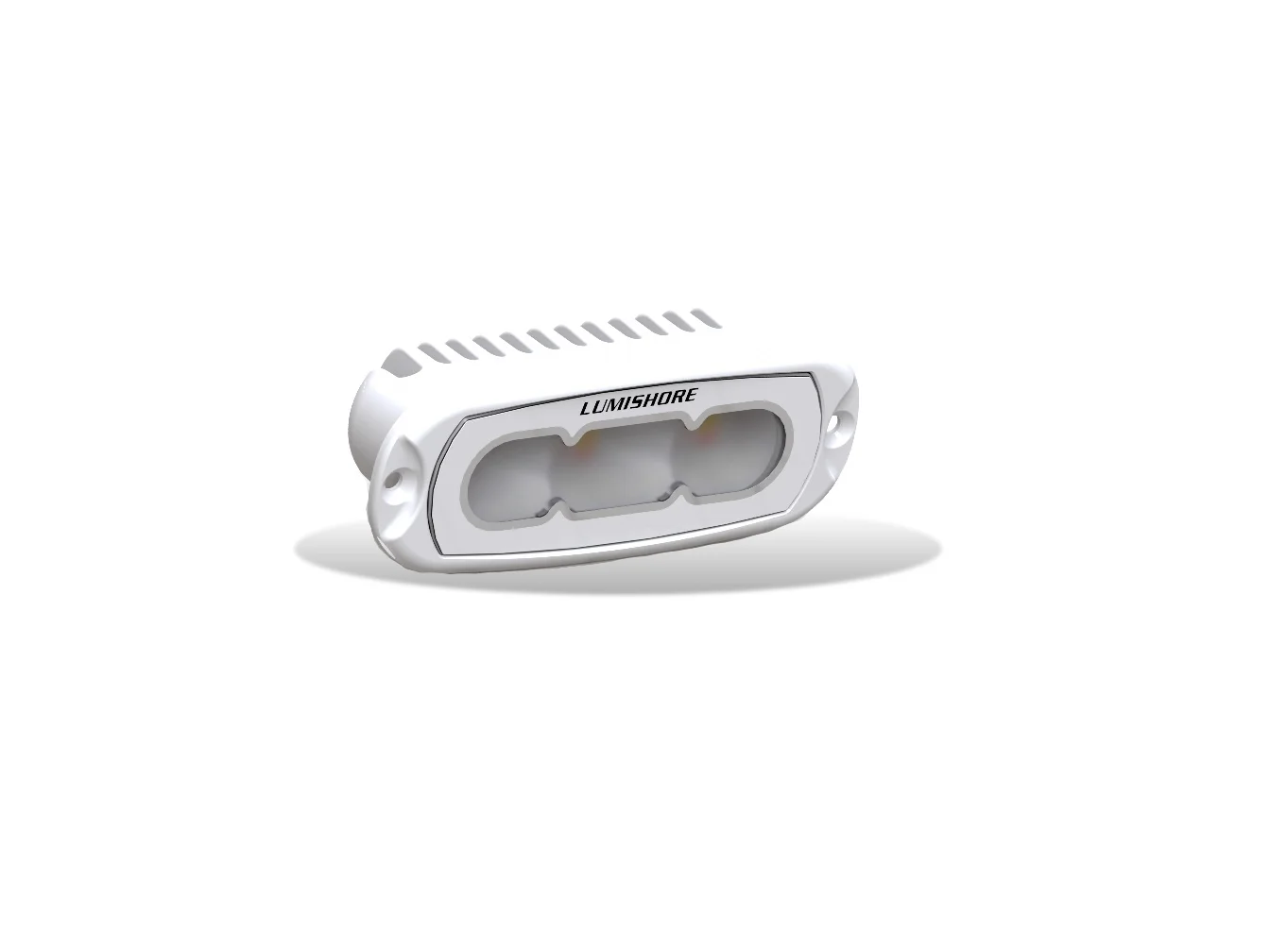 Lumishore’s 4" Flush Fit Flood Lights deliver powerful CRGBW illumination in a sleek, low-profile unit. Designed for decks, cockpits, and exterior mounting points like T-tops, arches, and transoms, they offer a wide oval beam (70°—90°) and smooth, blended colors — including both warm and cold white, plus red, green, and blue.
