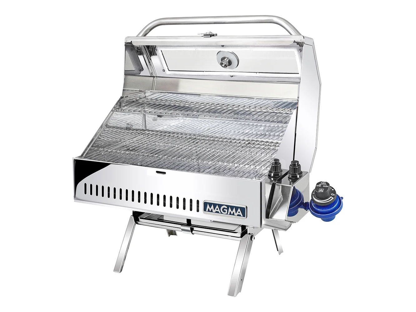The perfect addition for feeding a large crew, this versatile, portable, finely crafted grill is always ready for action. Features include: rounded edges for an elegant look, a dynamic combustion system that keeps the grill lit even in heavy winds, a dependable electronic ignition system, and a tempered glass viewing window. "Anti-Flare" Infrared technology produces intense, evenly distributed heat, reducing flare-ups, and immediately emulsifies drippings, giving your meal a great smoky flavor. Made in the U.S.A. and constructed entirely of 18-9 mirror-polished stainless steel to withstand even the harshest of environments. The primary and secondary grilling surface gives you the option of searing, slow cooking, or warming. Comes equipped with fold-away table top legs for go anywhere use and a hermetically sealed thermometer. The swiveling control valve/regulator, designed to use 1lb disposable propane fuel canisters, allows for quick, safe fuel canister exchanges, or easily adapts the grill to existing on-board low-pressure propane (LPG) or natural gas (CNG) fuel systems. "Heavy Duty" mounting hardware is recommended. Magma mounts, serving shelf, and fuel canisters sold separately.