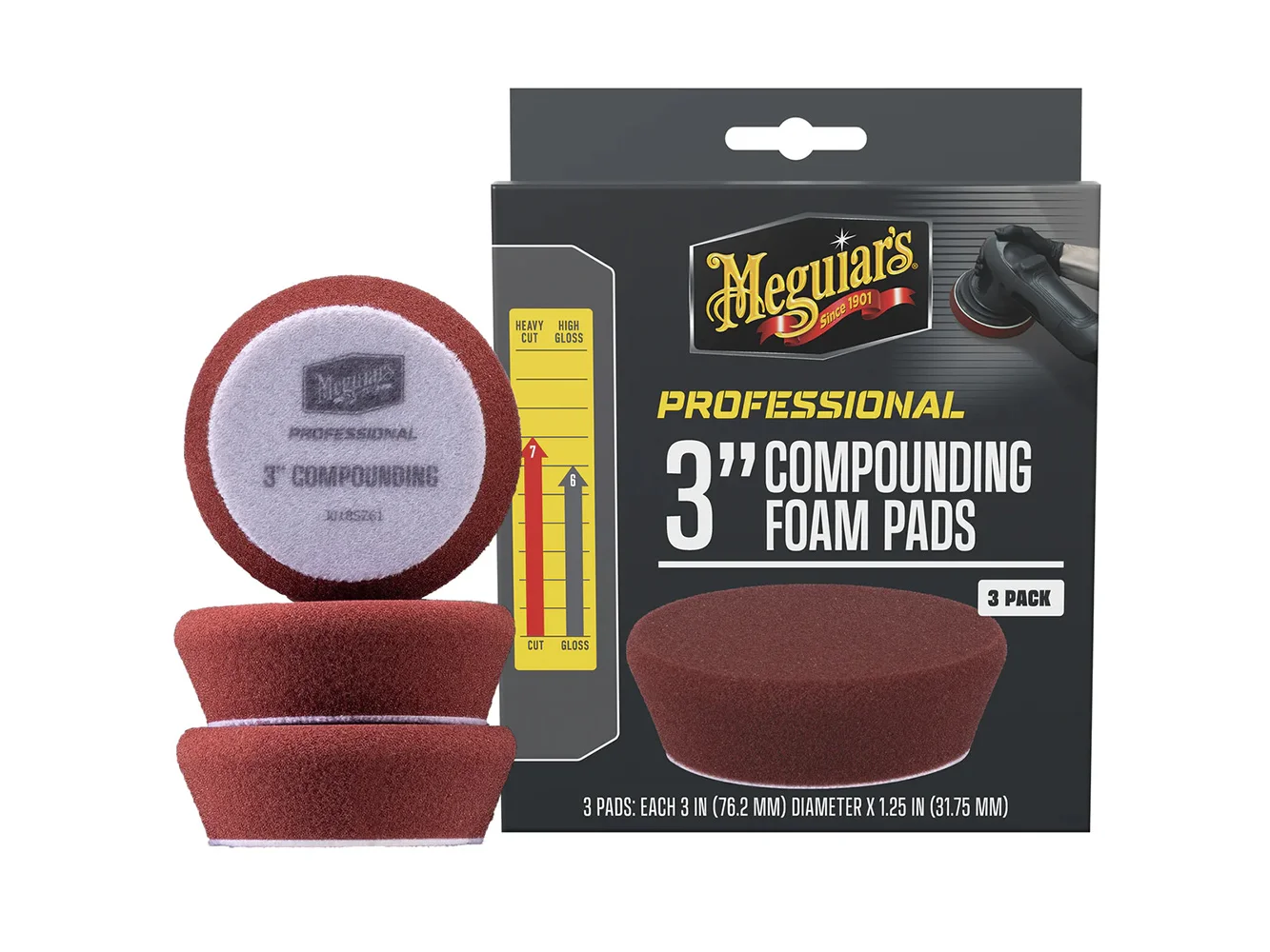 Unlock the true potential of your paint correction process with Meguiar's Professional 3" Foam Compounding Pads, available in a convenient 3-pack. Designed to tackle a wide range of surface defects, these cutting discs are the go-to choice for professional detailers and automotive enthusiasts alike. Eliminate unsightly scratches, acid rain marks, swirls, holograms, sanding marks, and other imperfections with the power of Meguiar's cutting-edge foam technology. These discs are engineered to swiftly and effectively remove heavy surface defects without creating swirl marks, delivering amazing results.