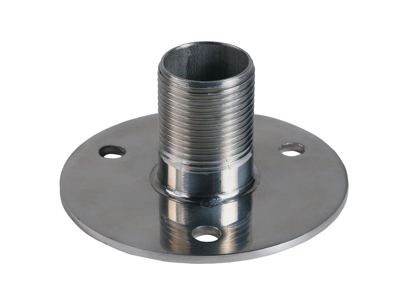 Shakespeare flange mounts can be used to attach marine antennas to deck or bulkhead. The mounts do not adjust for slanted surfaces, and do not allow lowering the antenna for fishing, passage under overhangs, or for boat storage or towing. They are usually used for small antennas, GPS and radar devices, and marine TV antennas atop radar arches and the like.