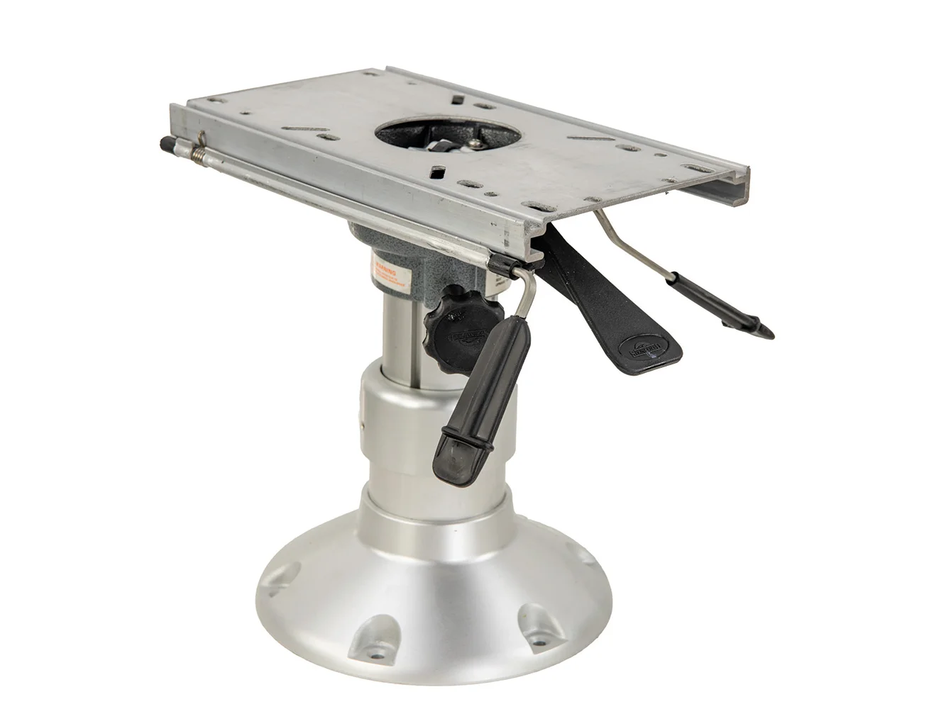 Package includes 2-7/8″ high-strength rigid 4-keyed anodized aluminum air-powered height adjustment pedestal (500 newton cylinder) with 9″ round anodized base, and locking Trac-Lock™ swivel & slide. 3-1/2″ outer post with 2-7/8″ inner post.