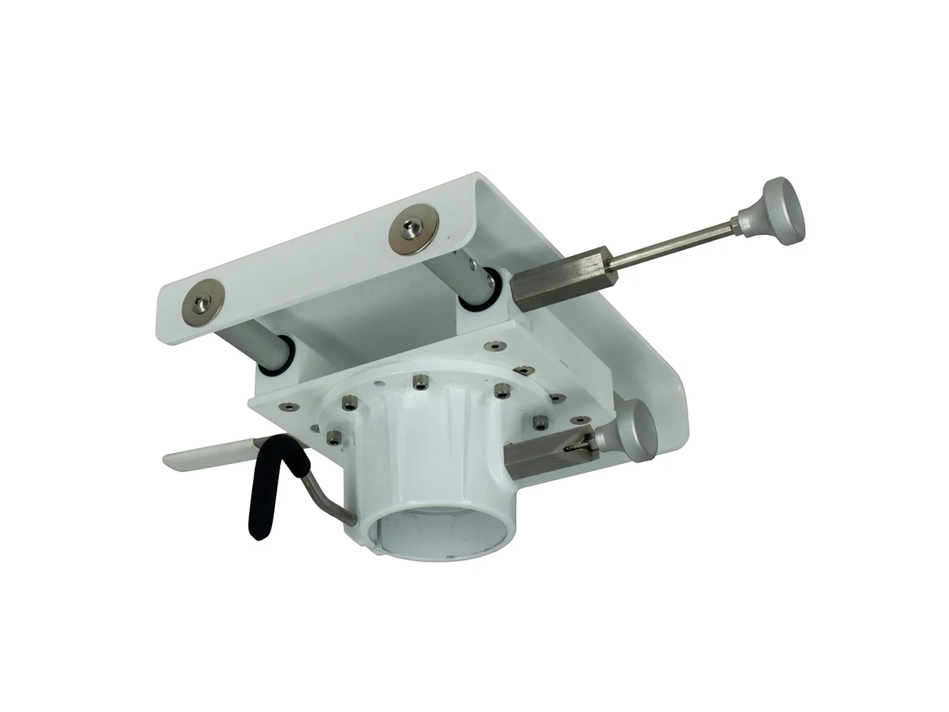 10-1/2″ x 14-1/2″ x 1/4″ aluminum formed slide plate with anodized aluminum finish and heavy-duty stainless steel lock pin. Large, easy-to-reach control knobs. Swivels on post. Slide travels 6″ fore and aft. Flip handle for locking pin.