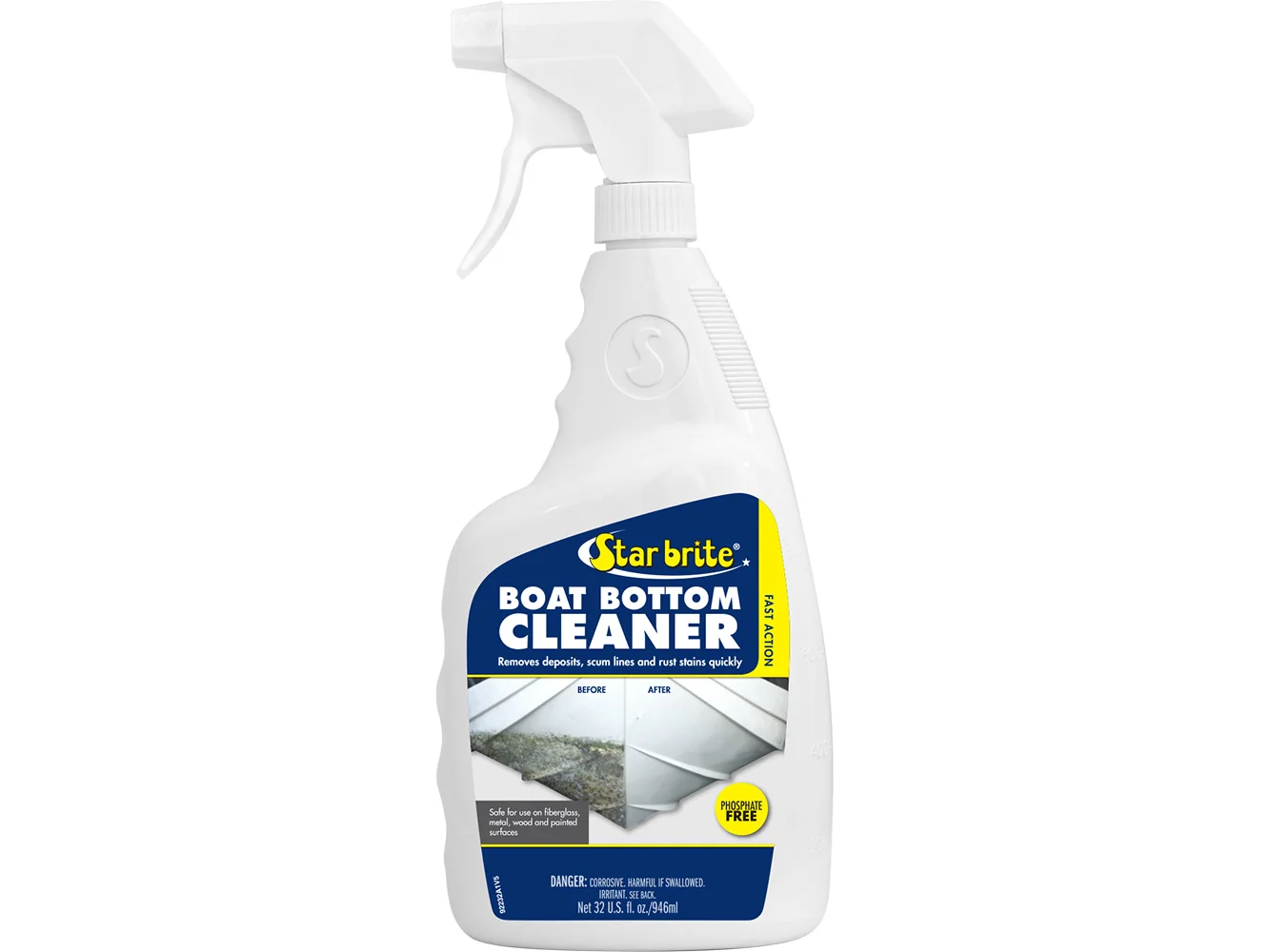 Star brite Boat Bottom Cleaner is a must-have for every boat owner. Its acid-based formula is designed to tackle the toughest stains and grime, ensuring your boat's hull remains in pristine condition. With Star brite, you can say goodbye to stubborn alkali water rings and yellow build-up that have been plaguing your boat for years. This powerful cleaner works effortlessly, eliminating the need for strenuous scraping or elbow grease. However, due to its potent formula, it's crucial to wear protective gear when using Star brite Boat Bottom Cleaner. This product is very caustic and can cause skin irritation. Therefore, it's recommended to use specific cleaning devices and follow proper disposal practices to ensure safety. Star brite Boat Bottom Cleaner – because your boat deserves nothing but the best. Remove the boat from the water. Allow deposits and stains to dry thoroughly. Stains and deposits found above the waterline may be removed while boat is in water. Apply product to the dry surface of hull using an all-plastic sprayer, non-nylon roller or brush. Keep deposits and stains wet and foaming with the product. Foaming indicates the product is removing the deposits. Reapply as needed to maintain foaming action. After 10 minutes of foaming action, most surfaces should be clean and ready for rinsing with water. Heavy deposits may require several applications and light scraping. If sprayer is used, pump fresh water through before storing.