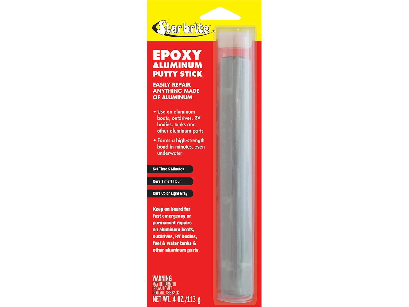 Provides quick, permanent repairs on aluminum surfaces, even underwater. Designed for aluminum boats, RV bodies, fuel tanks, gutters, and storm doors. The high-density formula bonds within minutes and withstands extreme temperatures and pressures.