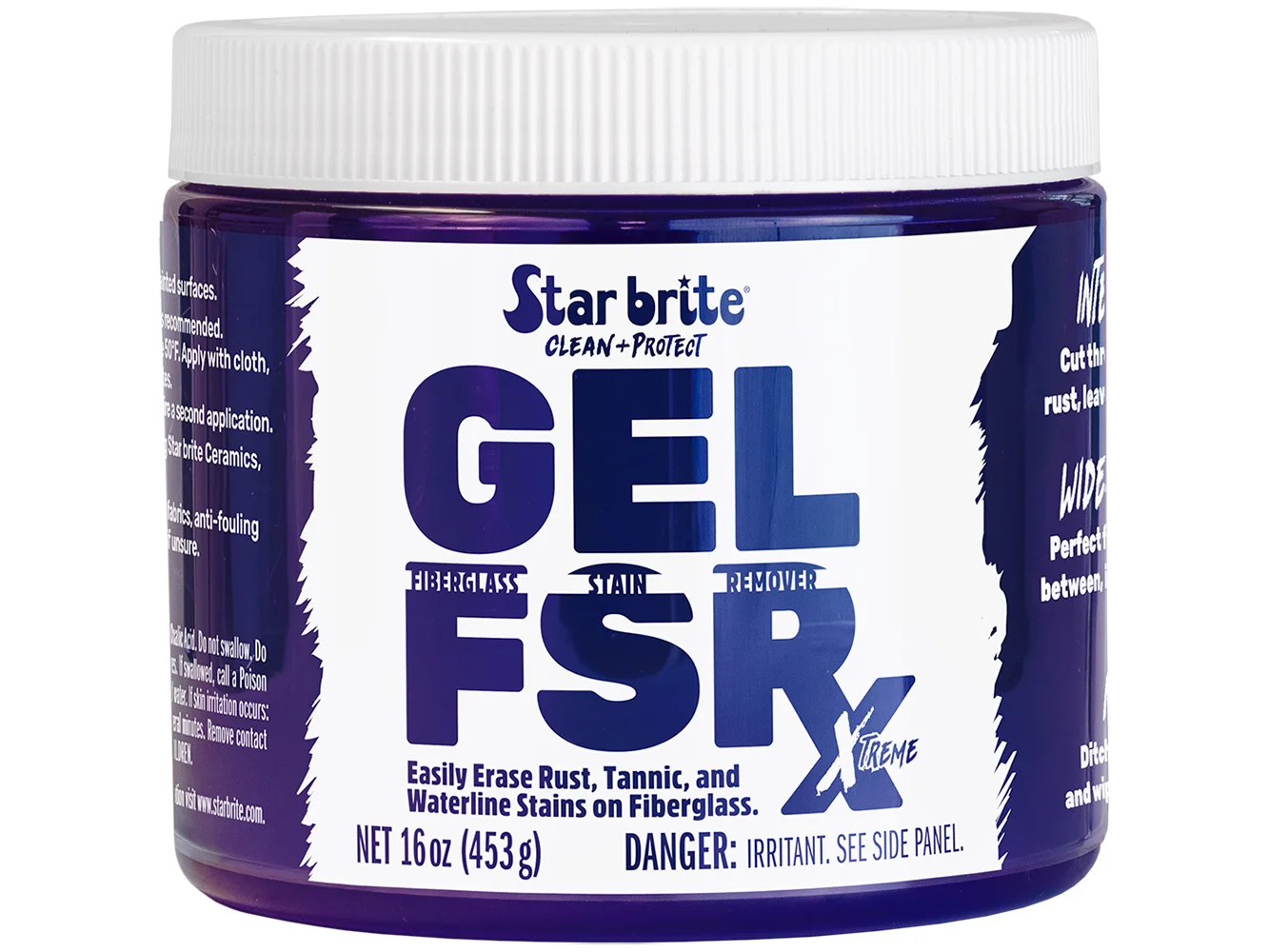 Powerful no-sanding fiberglass stain remover for rust, tannins, and waterline stains. Designed for use on boats and RVs.