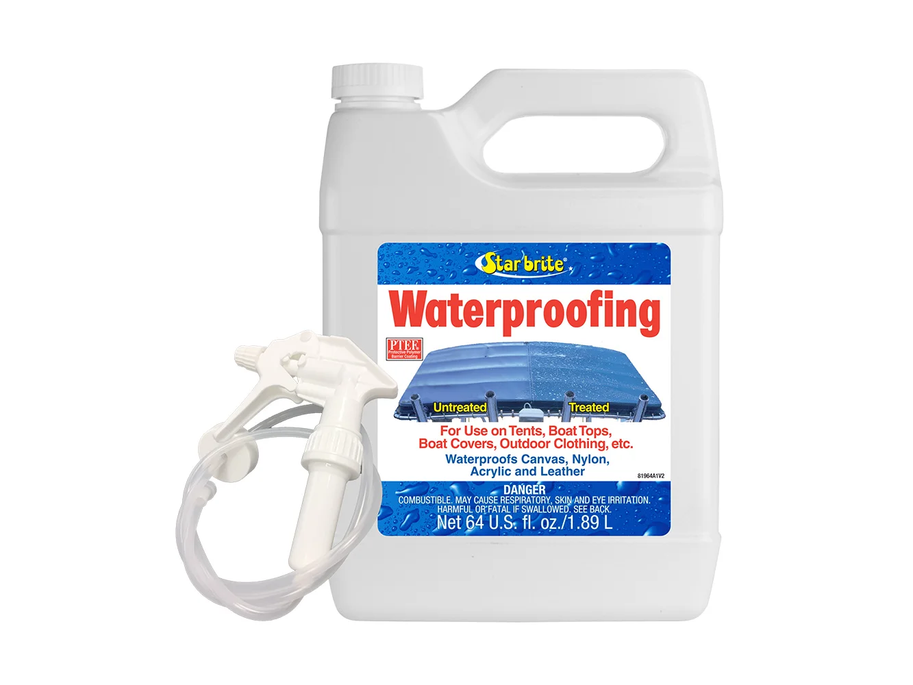 If the surface to be waterproofed is dirty or stained, clean it with Star brite Sail & Canvas Cleaner. Fabric to be treated must be dry. Apply enough Waterproofing with a sprayer, brush, or sponge to thoroughly wet the top surface. Take care to avoid overspray, drips, or penetration onto surfaces not being treated. Allow the treated item to dry for 6 hours before using. Do not fold or store the treated item until dry. Use only in a well-ventilated area. Not for use on hard, non-porous materials or plastic tarps which cannot absorb liquids.
