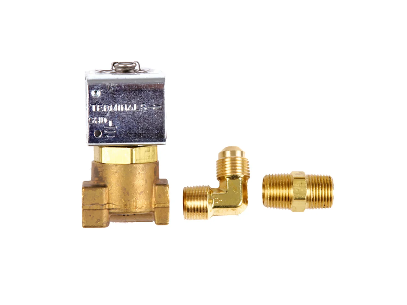 Low-Pressure Brass Solenoid Shut-Off Valve 1/4" Ports & 2 Brass Connection Fittings