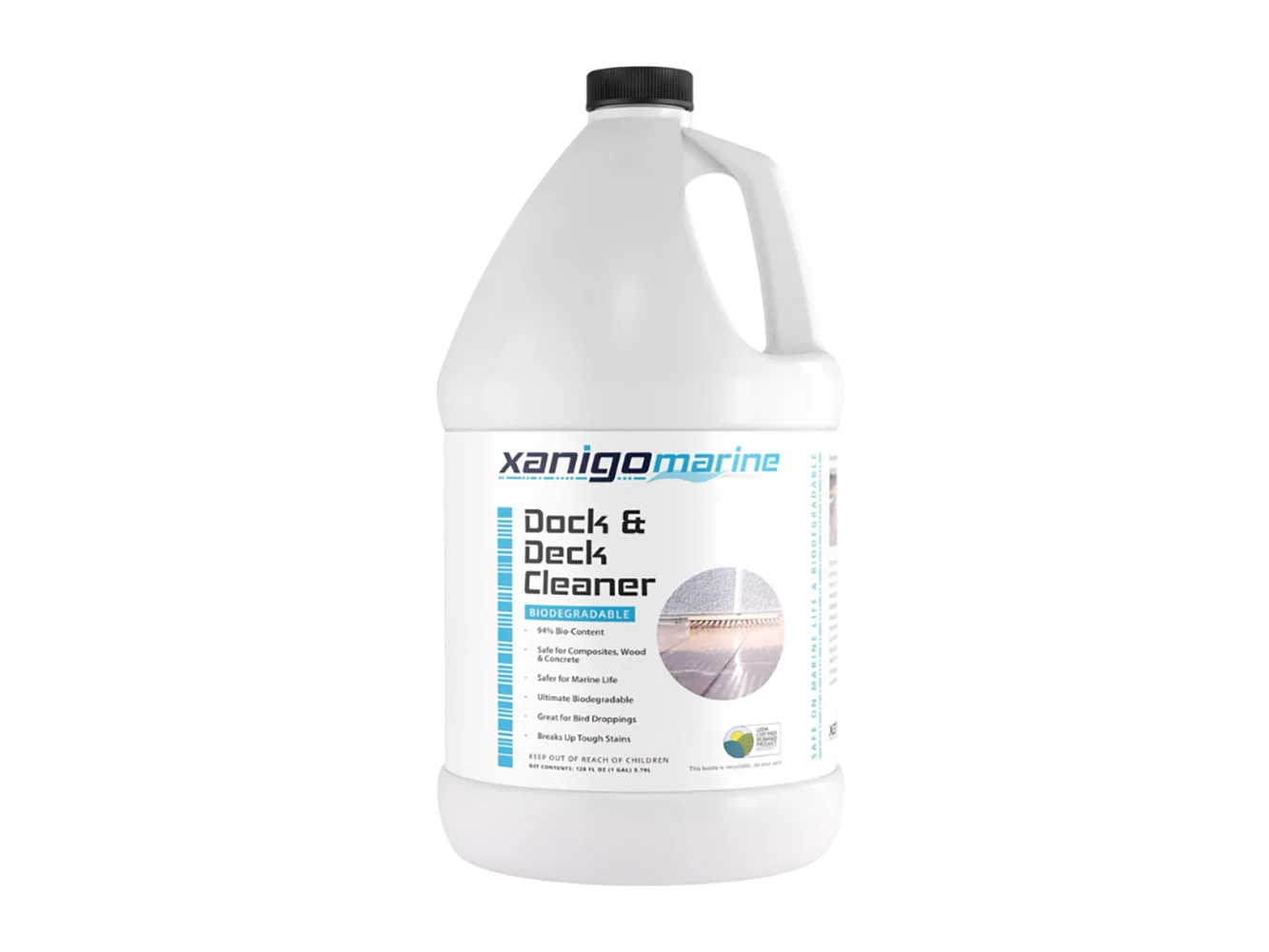 The base structure for the Xanigo Marine Dock & Deck Cleaner formula is made from plants, which enables it to have 94% bio-content as certified by the USDA. This uses next-generation renewable biosurfactant technology, is regarded as readily biodegradable, and is high-performing with high efficacy. Does not contain: Palm Oil, 1, 4-Dioxane, Formaldehyde, Proposition 65 Chemicals, Sulfates, Sodium Hydroxide, Glycol Ethers, Phosphates, Phthalates, Parabens, and Ammonia